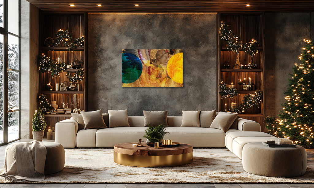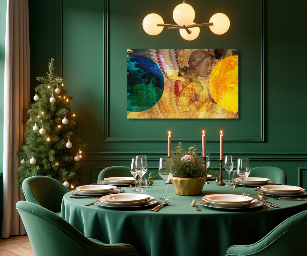 A recent viewing of Beato Angelico‘s works at Palazzo Strozzi (Florence) was the source of inspiration for this year’s holiday Iconic. Angels always feature in my work for this time of year, and the wings of his work are masterpieces of themselves.