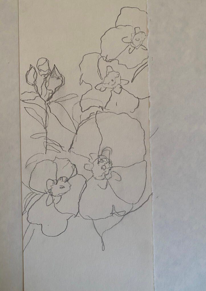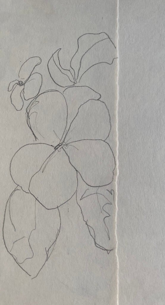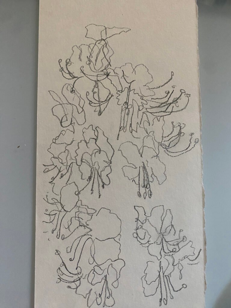 I began to write and paint the Latin and English names of the flowers, experimenting with different textures and weights. Four of the Bach flowers stood out to me, and emerged in distinct colorways. After finalizing the written names, I then sketched the flowers’ “portraits”, combining them with a kimono-like stripe to link them.