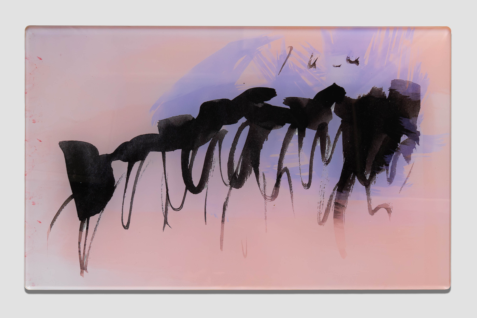 The exhibition presents three series of calligraphic abstractions: Prompts, Calasetta, and Principles, alongside Ovid, three large-scale works on wood; a single Sumi ink work, Beauty; and Iconics/Poetics, a sequence of approximately fifty small prints on photographic paper. The show is installed as a progression from black and white into color.