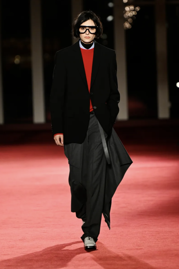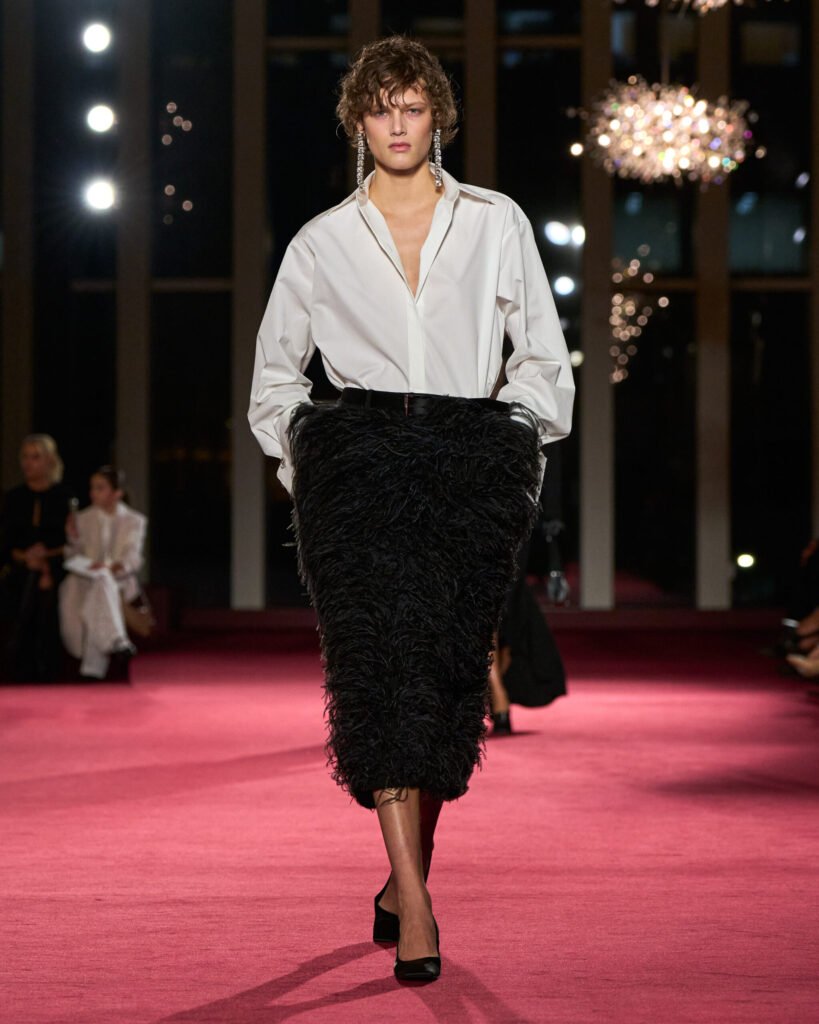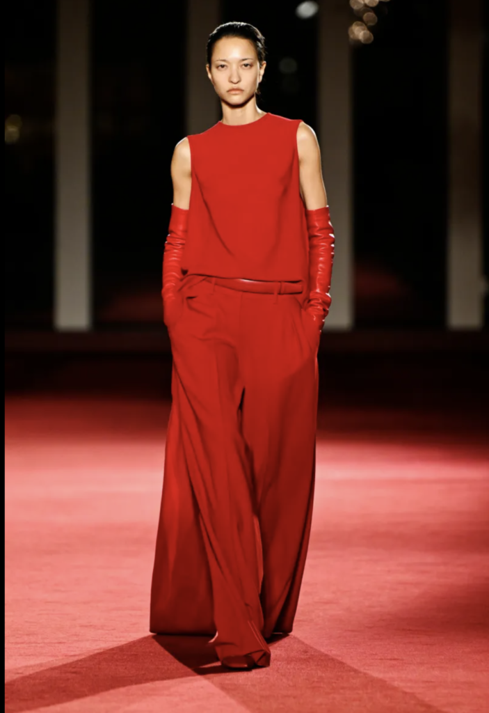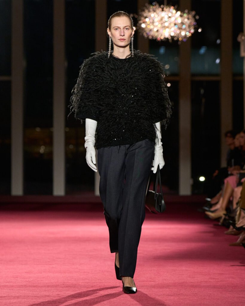 The backdrop was to die for – and the clothes in this collection were also stunning. Mannish vibes mixed with feathers, pops of iconic red; layers and swishing fabrics, conveying ease and luxury. The palette – of course, the classic New York palette of black, white and red.